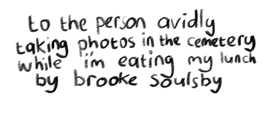 as I describe your low-set cap concealing eyes, your polar fleece zipped tight, and your pinkish fingers collecting grave angles, I realise that this does paint a shifty picture; look